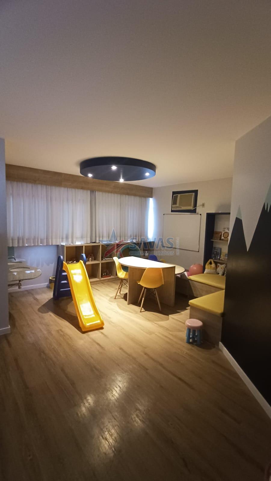 Condomínio com salão de festas decorado, piscina adulto/infantil e brinquedoteca infantil.